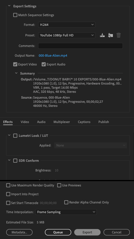 These are the settings for exporting a YouTube 1080p compressed video